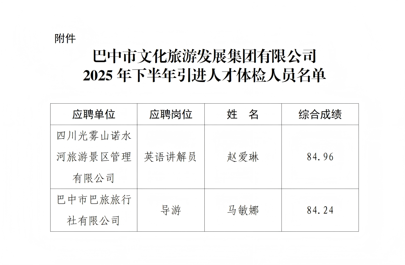 根據(jù)市委組織部《四川省巴中市2025年下半年引進高層次人才和急需緊缺專業(yè)人才公告》和《巴中市文化旅游發(fā)展集團有限公司關于2025年下半年引進人才資格審查合格人員名單及面試安排的公告》精神,現(xiàn)將引進人才進入體檢及考察相關事宜公告如下。
